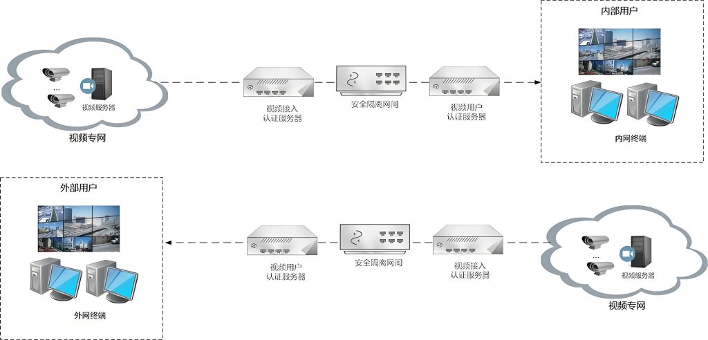 - 视频交换系统部署于视频专网(“公安视频监控专网”、“政府视频监控系统、互联网侧视频汇聚平台”等)与其他安全域网络(公安信息通信网、政务网等)之间,用于将视频图像安全、可靠、高效的引入到其他网络,供用户、应用系统或上下级视频平台使用,适用于公安、政府等单位需要实现跨安全域视频图像传输的应用场景。
